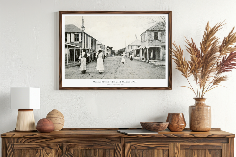 Denne smukke, historiske plakat viser et stemningsfuldt gadebillede fra Kongens Tværgade i Frederiksted på St. Croix – én af de tre tidligere danske vestindiske øer. Motivet er baseret på et originalt håndkoloreret postkort og gengiver livet og arkitekturen i kolonitidens Vestindien med en rolig og varm atmosfære.