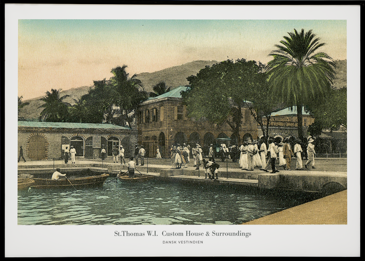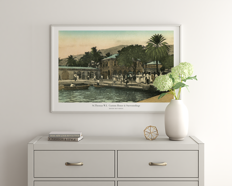 Bring historien ind i dit hjem med denne smukke, håndkolorerede plakat fra Dansk Vestindien. Motivet viser havneområdet på St. Thomas i begyndelsen af 1900-tallet, hvor lokale og koloniale liv mødes i et stemningsfuldt og detaljerigt gadebillede.