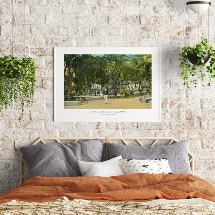 Denne smukke, historiske plakat viser et stemningsfuldt gadebillede fra Kongens Tværgade i Frederiksted på St. Croix – én af de tre tidligere danske vestindiske øer. Motivet er baseret på et originalt håndkoloreret postkort og gengiver livet og arkitekturen i kolonitidens Vestindien med en rolig og varm atmosfære.